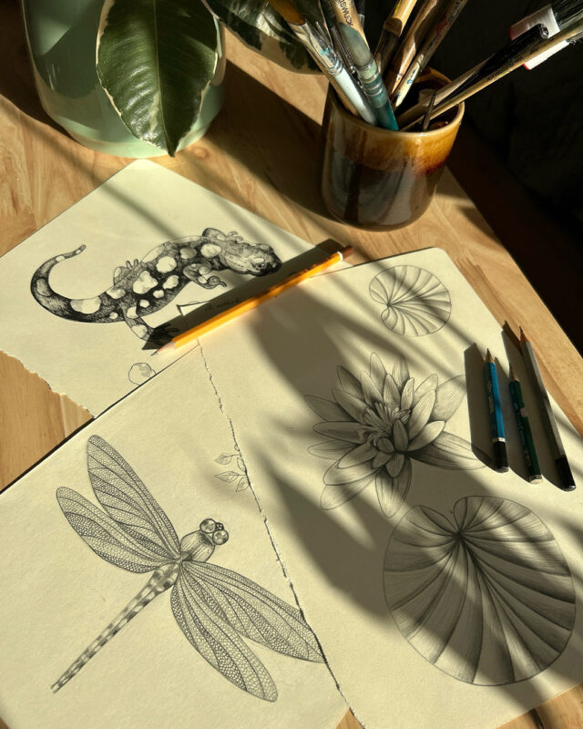Przy tworzeniu ilustracji uwielbiam inspirować się naturą i tym co nas otacza. A ponieważ dotąd większość pomysłów pojawia się podczas spacerów, w rezultacie późniejsze rysunki to najczęściej obserwacje ze świata natury, kadry uchwycone na fotografii, małe fragmenty przyrody lub zapamiętany gatunek nowo poznanej rośliny, wokół których buduję potem cały pasujący do nich ekosystem.