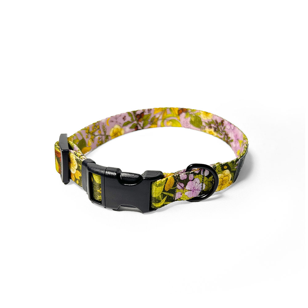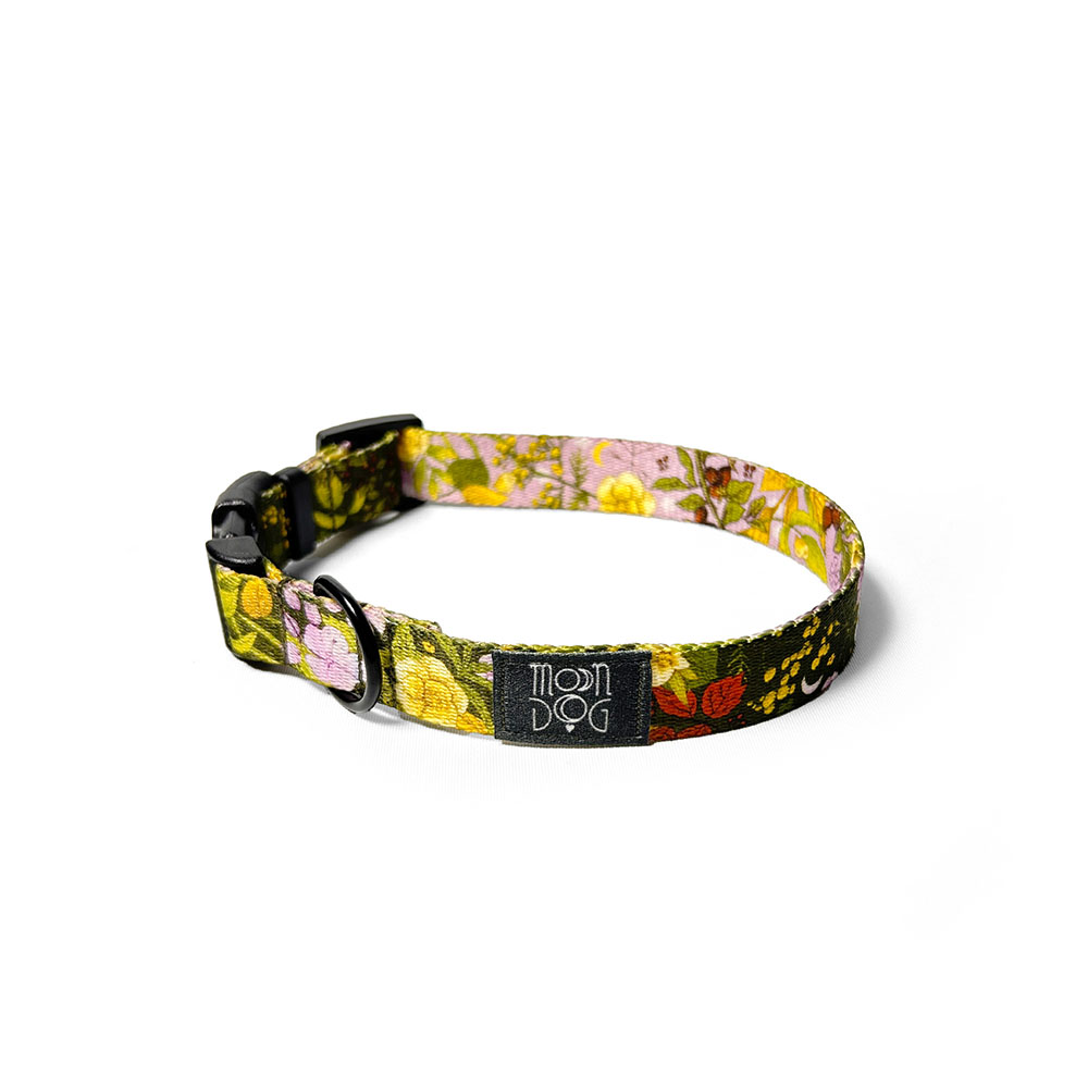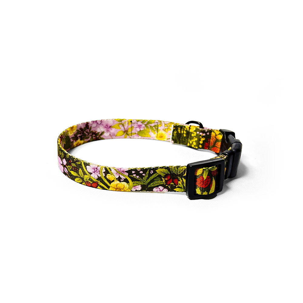 Obroże z klamrą szyjemy w rozmiarach od XXS do L, w szerokościach taśmy: 15 mm, 20 mm i 25 mm. Wzór SEPTEMBER EVERGREEN w ciemnozielonych odcieniach to wrześniowa, otulona ciepłymi, jesiennymi kolorami łąka. Na princie znajdują się rysowane odręcznie motywy dzikiej róży, wrotyczu i delikatnych, fioletowych dziko rosnących kwiatów geranium. Barwy powoli przechodzą z letnich tonów w odcienie wczesnej jesieni. Jest to wzór z pogranicza dwóch pór roku dla wszystkich, którzy kochają spacery wśród kolorowych drzew i lubią przyglądać się coraz wcześniejszym zachodom słońca.