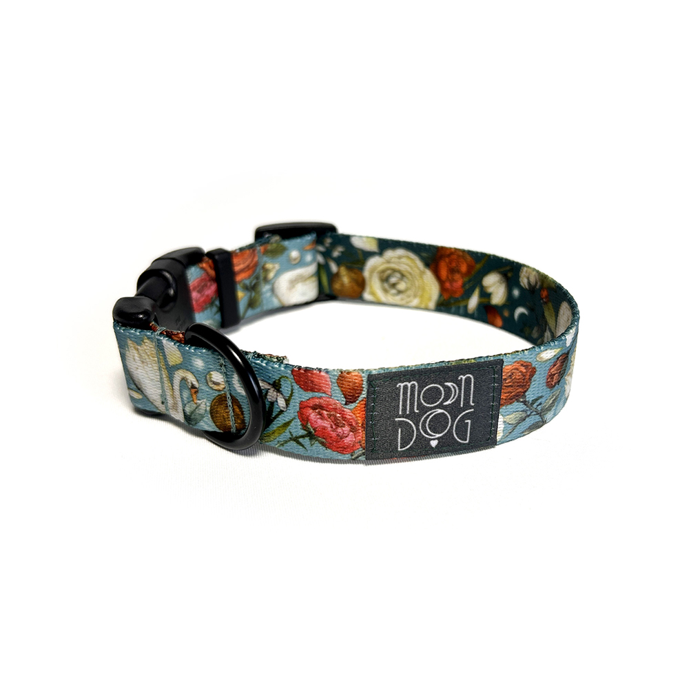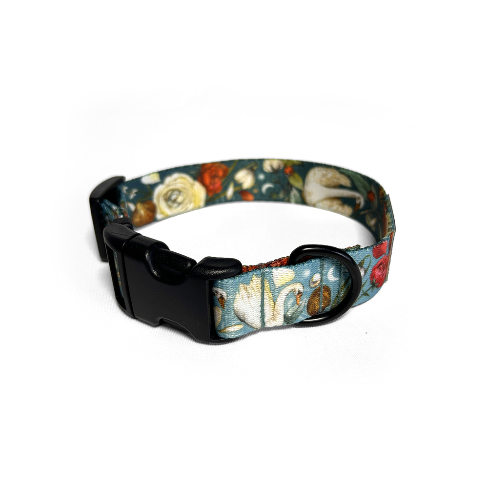 Obroże z klamrą szyjemy w rozmiarach od XXS do L, w szerokościach taśmy: 15 mm, 20 mm i 25 mm. Wzór SNOWDROP TURQUOISE w kolorze turkusowego błękitu to opowieść o momencie, w którym zima powoli ustępuje miejsca wiośnie. To czas pierwszych promieni słońca odbijających się od tafli wody i przyrody budzącej się do życia. Ten print łączy świeżość turkusowego błękitu lub głębię ciemnej zieleni z subtelnymi, kremowymi i pomarańczowymi akcentami kwiatów. Całość dopełniają delikatne przebiśniegi będące symbolem nadchodzącej wiosny i motywy pochodzące z nadrzecznych okolic, jeszcze niedawno pokrytych lodem: łabędzie, muszelki i perły. Wyrazista kolorystyka wzoru pięknie prezentuje się na sierści w różnych odcieniach, podkreślając charakter Twojego zwierzaka i wpasowując się w klimat spacerów zarówno w naturze, jak i w miejskich przestrzeniach, w każdą porę roku.