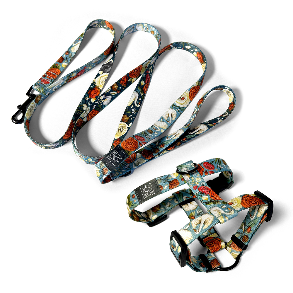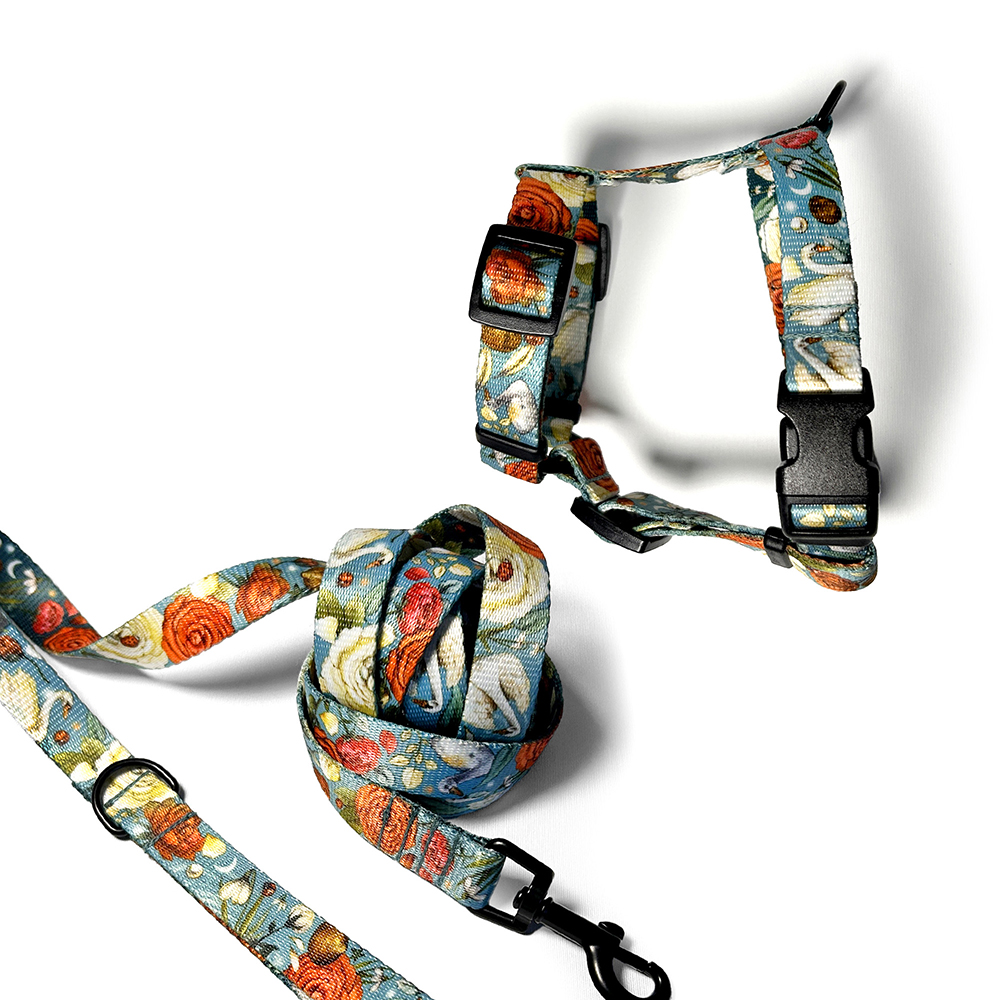 Zestaw spacerowy: Smycz miejska 200 mm o szerokości taśmy 20 mm lub 15 mm + Szelki typu guard szyjemy w rozmiarach od XXS do L, w szerokościach taśmy: 15 mm, 20 mm i 25 mm. Wzór SNOWDROP TURQUOISE w kolorze turkusowego błękitu to opowieść o momencie, w którym zima powoli ustępuje miejsca wiośnie. To czas pierwszych promieni słońca odbijających się od tafli wody i przyrody budzącej się do życia. Ten print łączy świeżość turkusowego błękitu lub głębię ciemnej zieleni z subtelnymi, kremowymi i pomarańczowymi akcentami kwiatów. Całość dopełniają delikatne przebiśniegi będące symbolem nadchodzącej wiosny i motywy pochodzące z nadrzecznych okolic, jeszcze niedawno pokrytych lodem: łabędzie, muszelki i perły. Wyrazista kolorystyka wzoru pięknie prezentuje się na sierści w różnych odcieniach, podkreślając charakter Twojego zwierzaka i wpasowując się w klimat spacerów zarówno w naturze, jak i w miejskich przestrzeniach, w każdą porę roku.