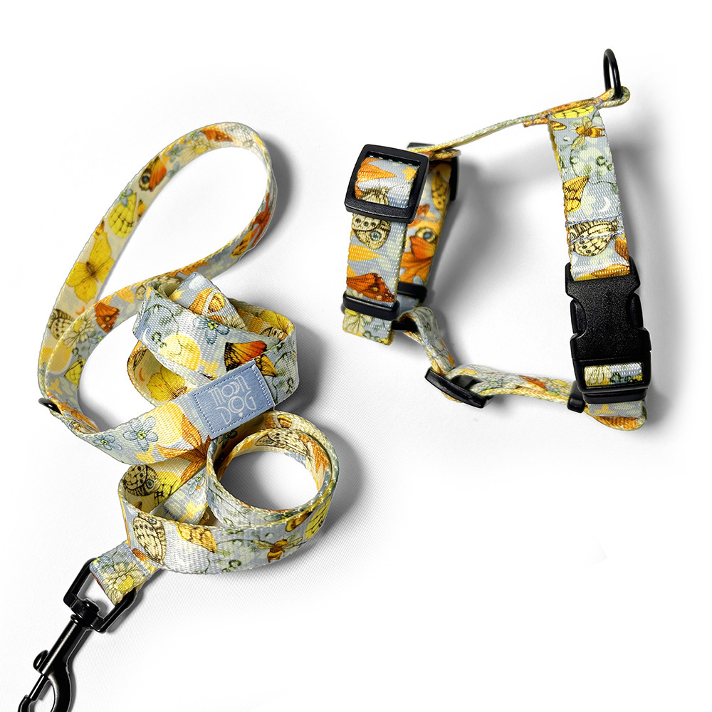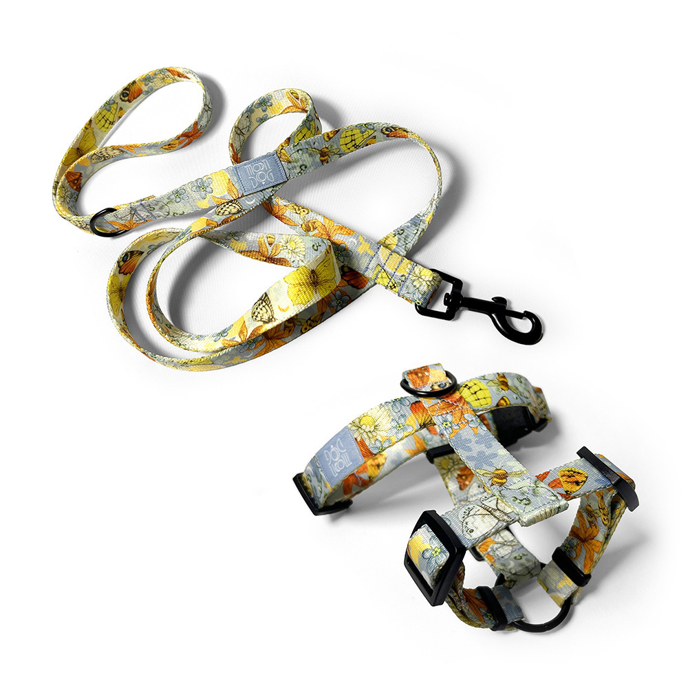 Zestaw spacerowy: Smycz miejska 200 mm o szerokości taśmy 20 mm + Szelki typu guard szyjemy w rozmiarach od XXS do L, w szerokościach taśmy: 15 mm, 20 mm i 25 mm. Wzór SUNDAY BLUE w błękitnych barwach to kwintesencja letniej słonecznej łąki, barwna kompozycja z polnych kwiatów, roślin i motyli inspirowana spokojem niedzielnego poranka. Z lekką, wygodną i solidną konstrukcją naszych akcesoriów można mieć pewność, że każdy spacer zamieni się w bezpieczną, wygodną, a do tego pełną stylu przygodę.